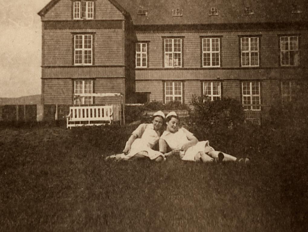 Camilla, frænka Hólmfríðar, fyrir framan Holdsveikraspítalann